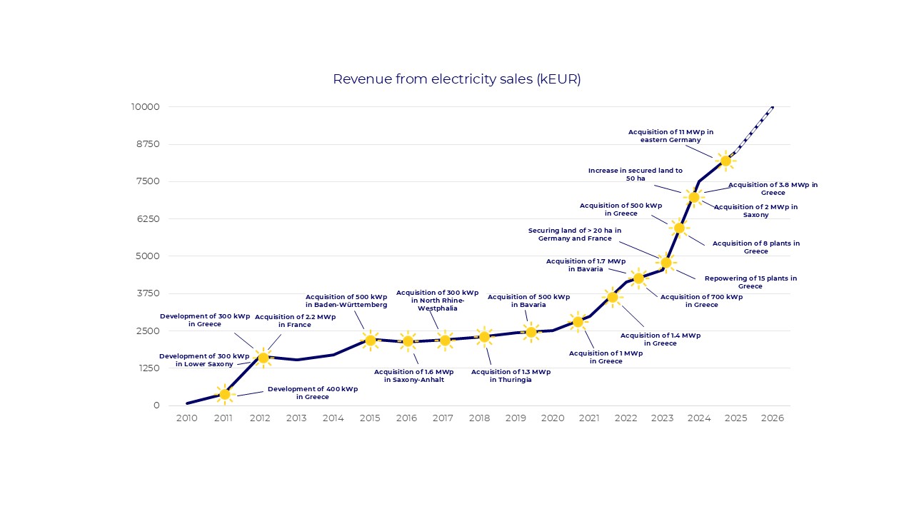 Σήμερα, ο Όμιλος αποτελείται από επτά επενδυτικές εταιρείες με έδρα τη Γερμανία, εκ των οποίων οι δύο ιδρύθηκαν μόλις το 2024. Η επέκταση θα συνεχιστεί τα επόμενα χρόνια, ιδιαίτερα στη Γερμανία και την Ελλάδα. Τα ετήσια έσοδα από την πώληση ενέργειας αναμένεται να φτάσουν τα €10 εκατ. Οι επιχειρηματικές δραστηριότητες παραμένουν αποκλειστικά στον τομέα της ηλιακής ενέργειας και της παραγωγής ηλιακής ενέργειας στη Γερμανία, την Ελλάδα και τη Γαλλία. Η ομάδα του Ομίλου αποτελείται πλέον από 24 άτομα, εκ των οποίων τα 13 βρίσκονται στην Ελλάδα. Ο Όμιλος παράγει ετησίως περίπου 35.000 MWh ηλεκτρικής ενέργειας (ικανές να τροφοδοτήσουν πάνω από 15.000 νοικοκυριά). Το συνολικό χαρτοφυλάκιο αποτελείται από περίπου 70 φωτοβολταϊκούς σταθμούς με ονομαστική ισχύ άνω των 30 MWp. Ο συνολικός όγκος επενδύσεων ανέρχεται σε περίπου €50 εκατ., ενώ τα ετήσια έσοδα από πωλήσεις ηλεκτρικής ενέργειας ανέρχονται σε €8,5 εκατ.